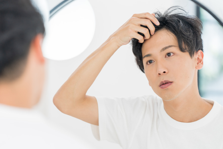 思春期以降、急激に増える男性ホルモンの変化の影響により、前頭部から頭頂部にかけての髪が細く薄毛化する症状です。前頭部・頭頂部のいずれかが薄くなる場合もあれば、両方同時に症状が出る場合もあり、その進行度スピードは人によって様々です。