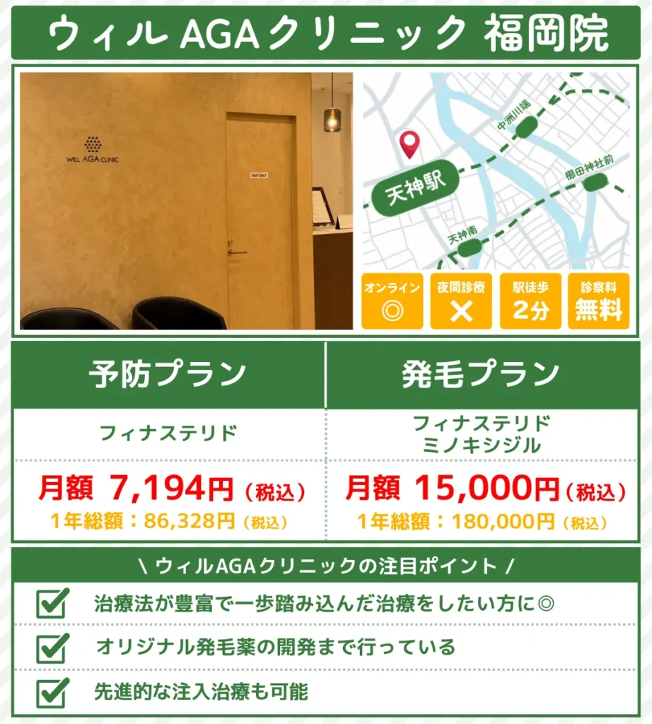 福岡のAGA治療ができるクリニックの料金及び治療法等の調査結果(対象:14院)2026年1月更新-ヘアケアクリニック編集部調べ